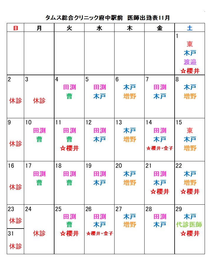 2025年 11月医師出勤表■ 2025年10月9日 2025年11月の医師勤務表を更新しました LINE予約がオススメです!友達登録するだけで予約も変更もキャンセルも可能です♪ やむを得ず変更になる場合がございます。予めご了承ください。