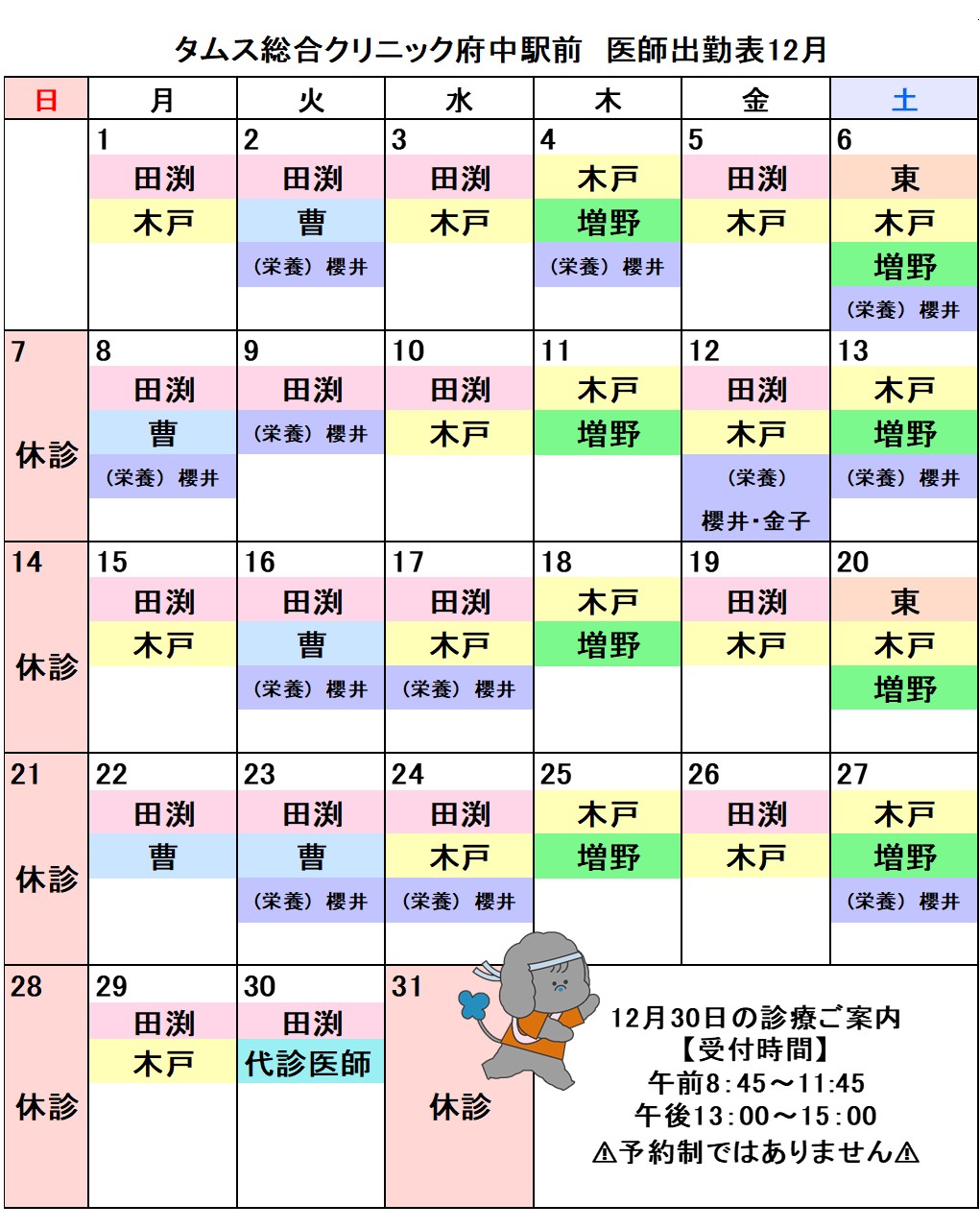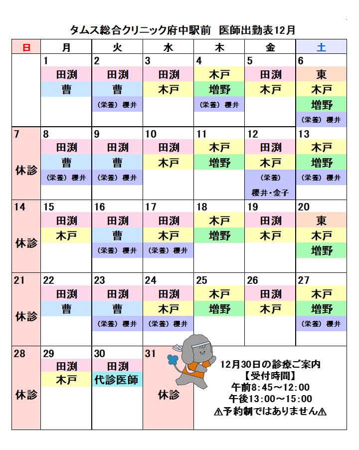 2025年 12月医師出勤表■ 2025年11月15日 2025年12月の医師勤務表を更新しました LINE予約がオススメです! 友達登録するだけで予約も変更もキャンセルも可能です♪ やむを得ず変更になる場合がございます。予めご了承ください。