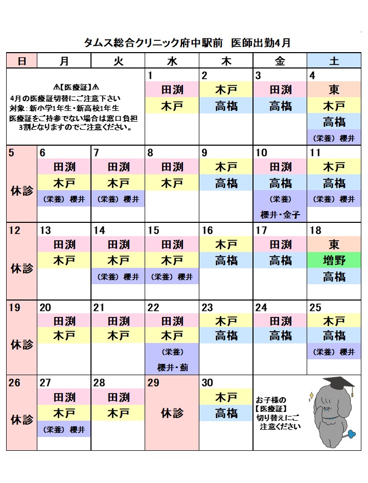 2026年4月の医師勤務表を更新しました